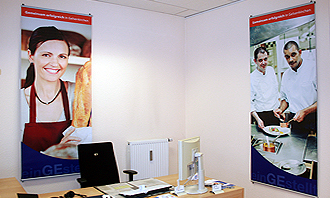 Displays fertigen wir nach Ihren Vorstellungen. Zum Aufstellen oder Hängen mit hochwertigen Aluminiumschienen.
